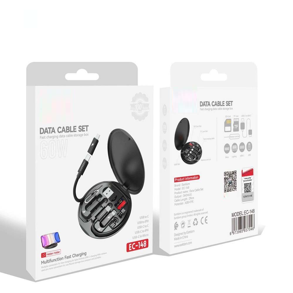 Stay organized and connected with the EC148 Type C USB Charging Cable with Multi-Function Portable USB Adapter Card Storage Set, a compact and versatile solution for all your charging and data transfer needs. Designed for travelers and tech enthusiasts, this 4-in-1 cable and storage set combines functionality and convenience in a sleek and portable package.The storage box includes dedicated slots for a USB-A adapter, Micro SIM, two Nano SIM cards, and a 29cm fast-charging Type-C cable. The storage case is compact, making it easy to carry in your pocket, purse, or backpack while keeping all your essential adapters and SIM cards safe and organized.The Type-C to Type-C cable supports fast charging and data transfer, while the included adapters allow compatibility with Lightning, Micro-USB, and USB-A devices. Whether you’re charging a smartphone, tablet, or other electronic gadgets, this cable set ensures seamless connectivity and fast performance.The EC148 Multi-Function USB Adapter Set is ideal for international travel, business trips, and everyday use. Its thoughtful design also includes a SIM retrieval pin slot, ensuring you’re always ready to swap SIM cards when necessary. Built with high-quality materials, this charging cable and adapter set offers durability and reliability for long-term use.Key Features:4-in-1 Cable & Adapter Set: Includes a Type-C to Type-C cable with Micro-USB, Lightning, and USB-A adapters for wide compatibility.Compact Storage Box: Features dedicated slots for USB-A, Micro SIM, two Nano SIM cards, 29cm Type-C cable, and a SIM retrieval pin.Fast Charging & Data Transfer: Supports high-speed charging and data transfer for multiple devices.Universal Compatibility: Works with smartphones, tablets, laptops, and other devices requiring USB-A, Type-C, Micro-USB, or Lightning connections.Portable & Travel-Friendly: Lightweight and compact design makes it perfect for travel, business, and daily use.Durable & Reliable: Built with premium materials to ensure long-lasting performance and safety.SIM Storage & Retrieval: Keep your SIM cards secure and easily accessible with the included retrieval pin slot.Keywords:multi-function USB charging cable, EC148 Type-C data cable, portable USB adapter set, fast charging Type-C cable, 4-in-1 charging cable, compact USB adapter storage, travel-friendly charging cable, Type-C to Lightning cable, Micro-USB adapter set, universal charging cable, SIM card storage box, USB-A adapter cable, data transfer Type-C cable, portable SIM card holder, all-in-one charging solution.